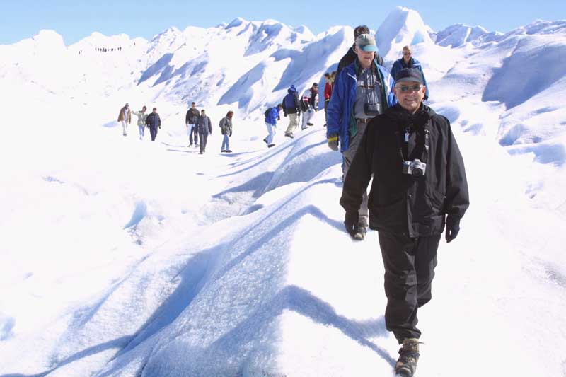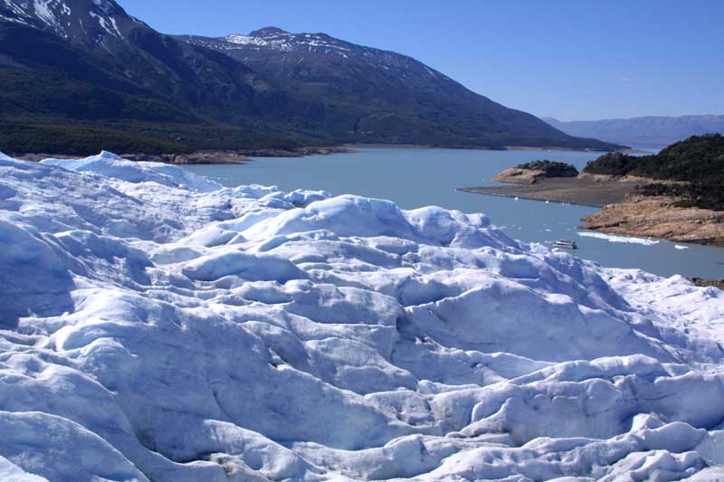 We got next to the glacier, put on the crampons, and then after a few minutes of instruction, started walking up the sloped side. Glaciers are compacted snow rather than hard blocks of ice, so the crampons grip readily. We shortly reached the top. Almost immediately, we reached an ice cave. In that picture, Steve is standing, or rather stooping, in the cave. The last picture shows the view from the glacier, south towards Lago Argentino and El Calafate.