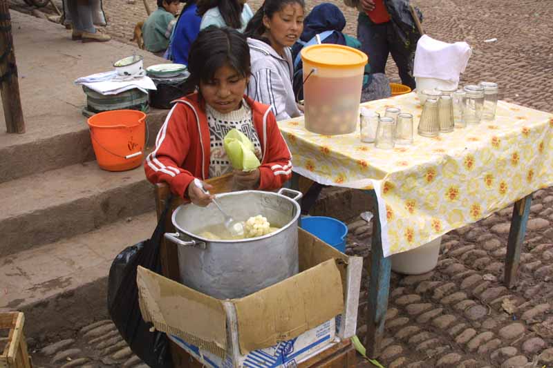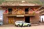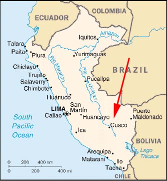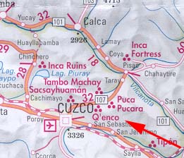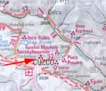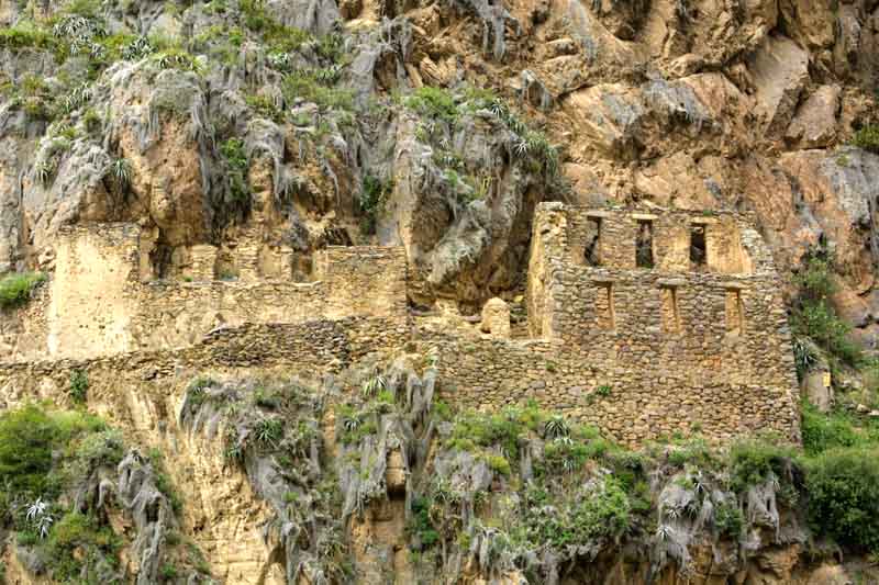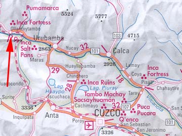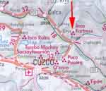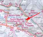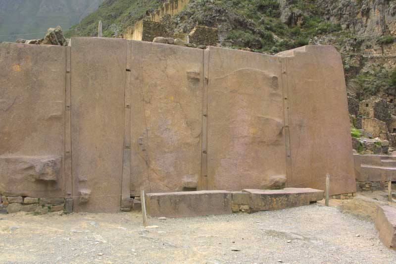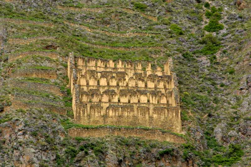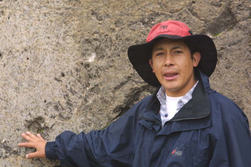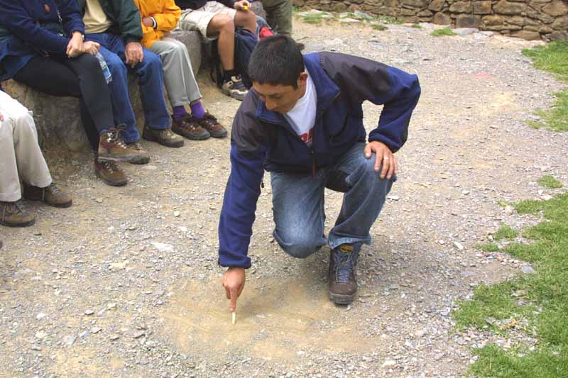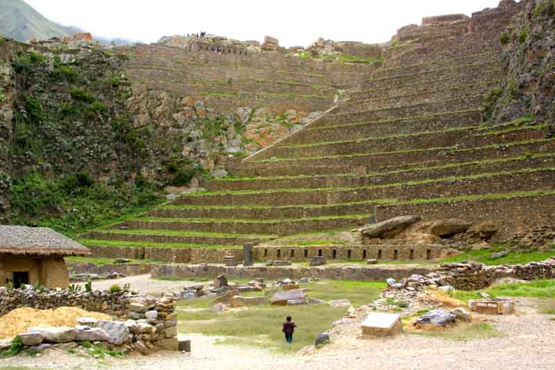 At the end of the road which leads towards Machu Picchu is Ollantay Tambo. It is referred to as a fortress, probably because it was attacked by the Spaniards, although it most likely was built as a simple settlement. Up on the opposite side are a number of storage buildings, located there because it is always windy and this kept the food which was stored there dry. Our guide, Manuel, likes to make illustrations in the ground.