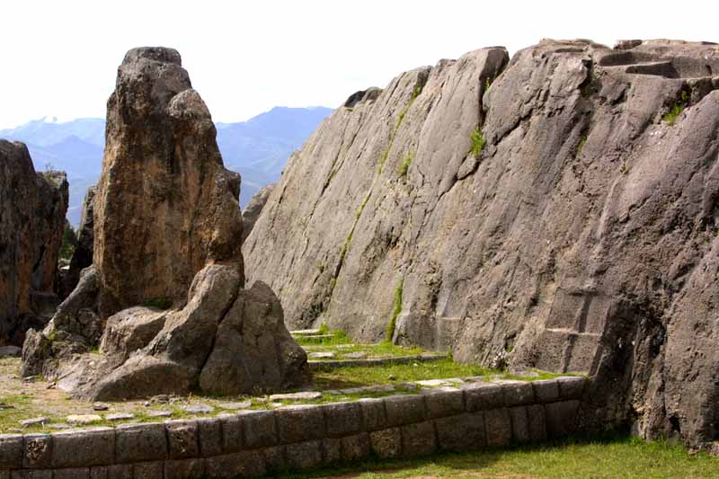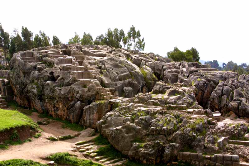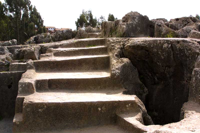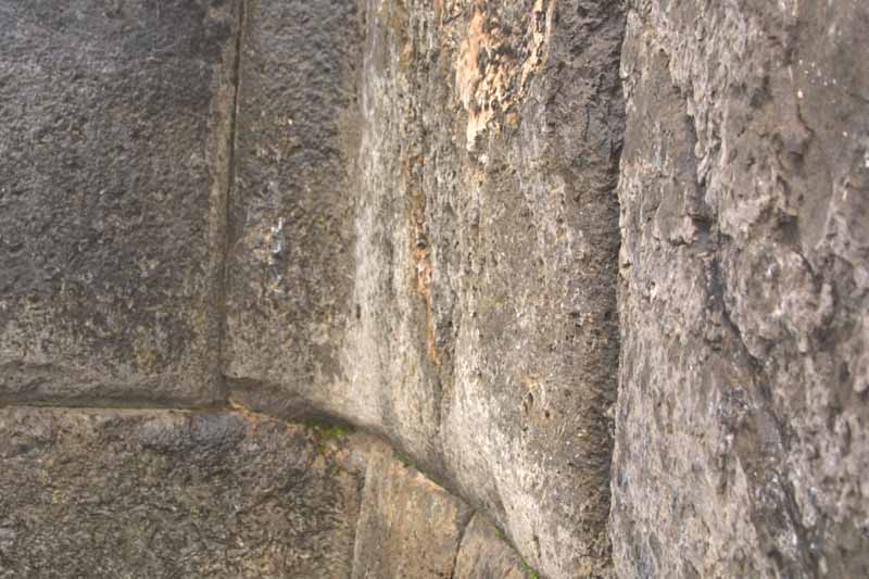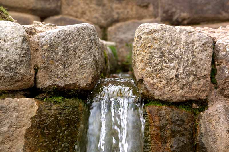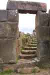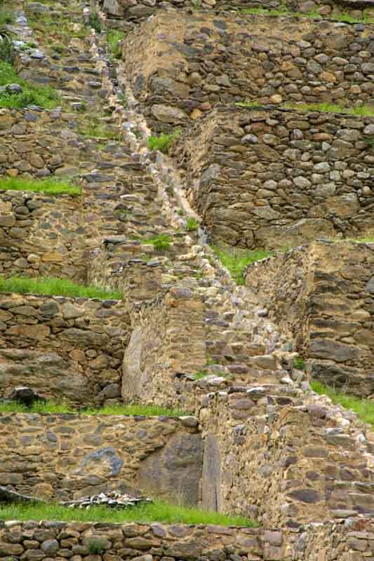 An interesting feature of this, and other Inca sites, is the system of aquaducts leading water everywhere. The aquaduct seen in the close-up comes down from the top, just to the right of the stairs.