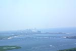 on one of the buildings which shines when the sun is right. The reflection made it through the haze, even if