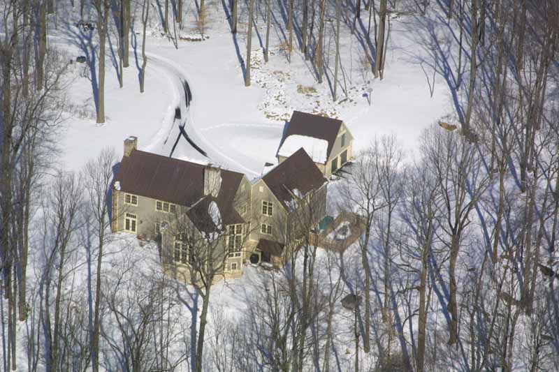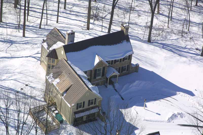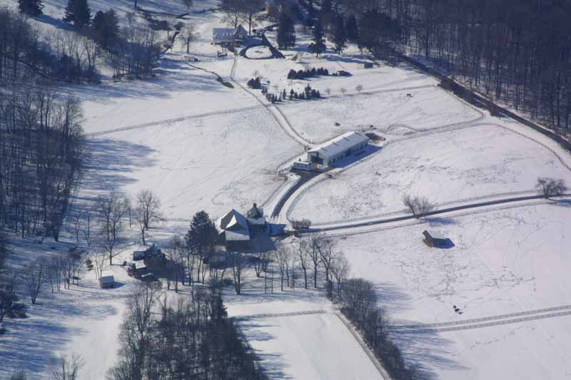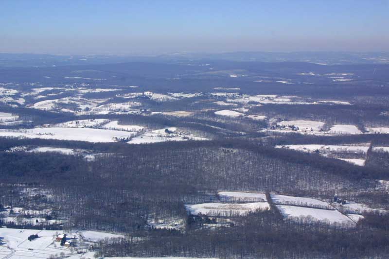 On the 31st, I had a helicopter lesson. I had my camera with me because I was going to fly the Cherokee out afterward and do some pictures. John suggested I take the camera on the lesson, and he'd fly while I was shooting. The closeups of the house were taken from the R22, and the rest were from the Cherokee. The very first picture shows a neighbor's farm in the foreground, and the Poconos in the background. If you look at the pattern of four fields in the lower right corner, look directly above the upper left field in that group, and if you look closely, you'll see our house at the top of the first hill.