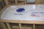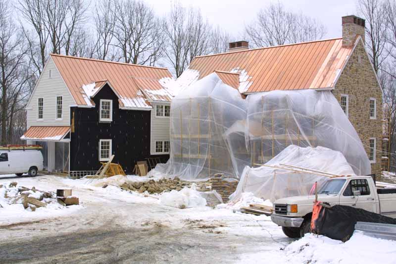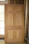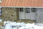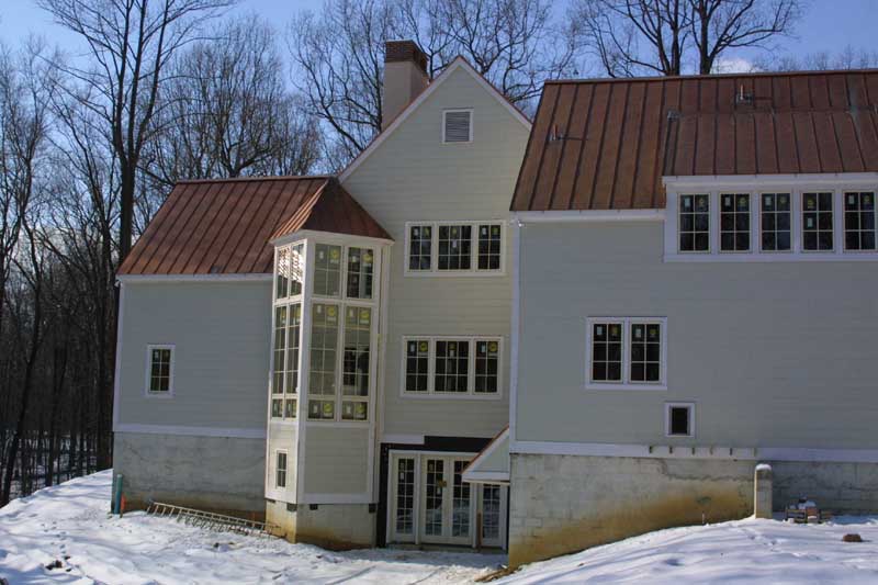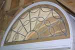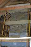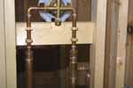 Meanwhile, things are happening on the inside. On the plumbing front, they had the templates out for the whirlpool baths so we could decide where to put the fixtures. The detail shot shows how the recirculating hot water system works: we will have instant hot water because the hot water system continuously recirculates. The small pipe on the right hand side in the return pipe for the hot water. The other interior shots are the chimney exterior in the library, the antique transom, and the front door (which is cuurently in the den!).