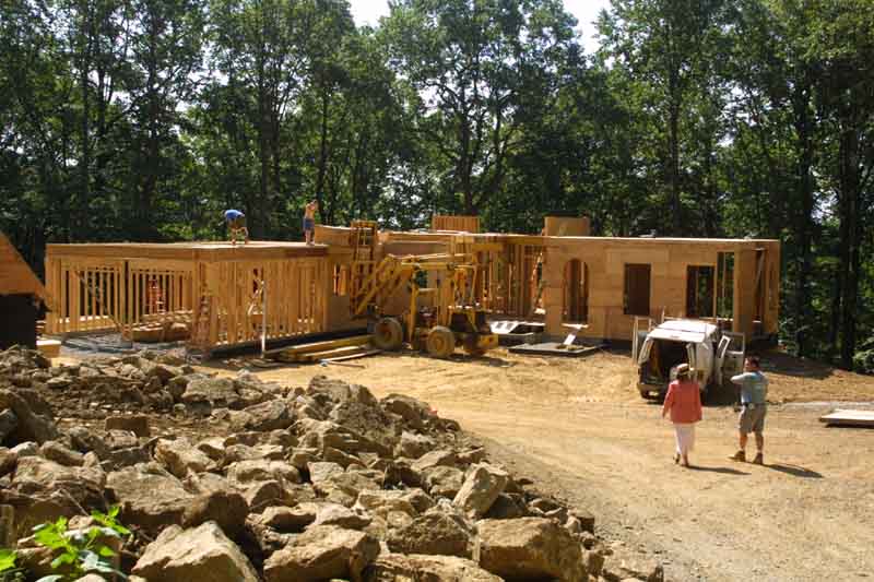 The first floor is now framed, and the barn is getting a roof! The well drilling is now complete (we ended up going down 800').
