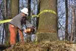 When we arrived on site this time, there was yellow caution tape where we usually park my truck. There were high winds the night before and a very large poplar tree was very close to coming down by itself. The contractor first tried to push it over with a forklift (and to try lifting the roots up as well), but it wouldn't quite go. Finally, the guy who had done the site prep work came over. It only took him about a minute to fell the tree...
