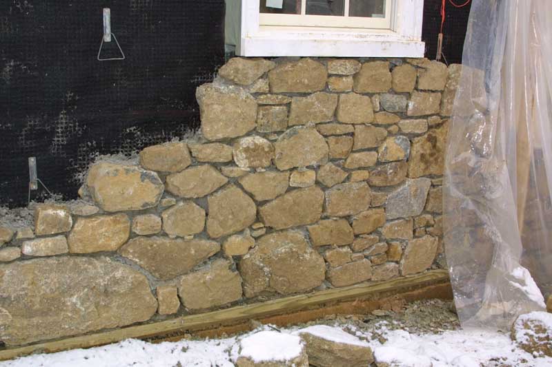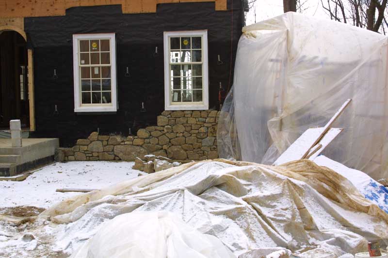 The masons have started the stone work. The plastic sheet is used with a heater to keep the area where they work warm so that the mortar sets properly.