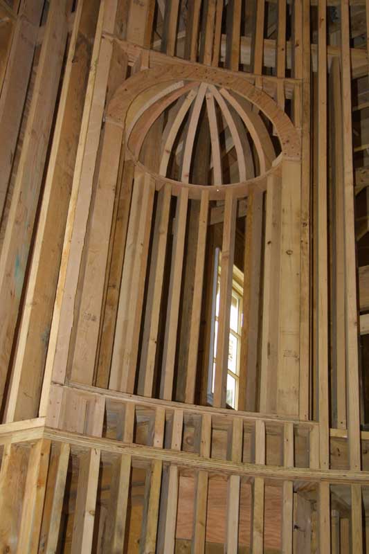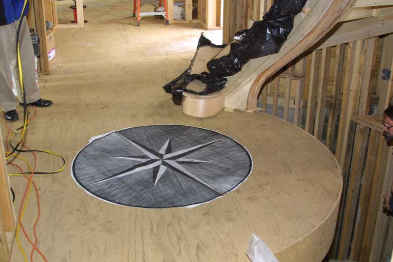 We now have a staircase! The compass rose mockup was used to determine what size we wanted the compass rose inlay to be. And finally, the niche by the stairway is shown. No doubt it will house a grecian urn or some such...