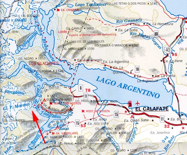 To help you get a feel for the geography, the map on the left will show you where Lago Argentino is located relative to the rest of Patagonia, and the map on the right will show where the glacier is located.