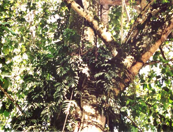 Here we are near the village of Coroma on the Coen river. These pictures may give you some idea of just how big rain forest trees get. The trees are covered with plants called epiphytes. These are not parasites, and do not damage the trees -- philadendron is an example of an epiphyte.
