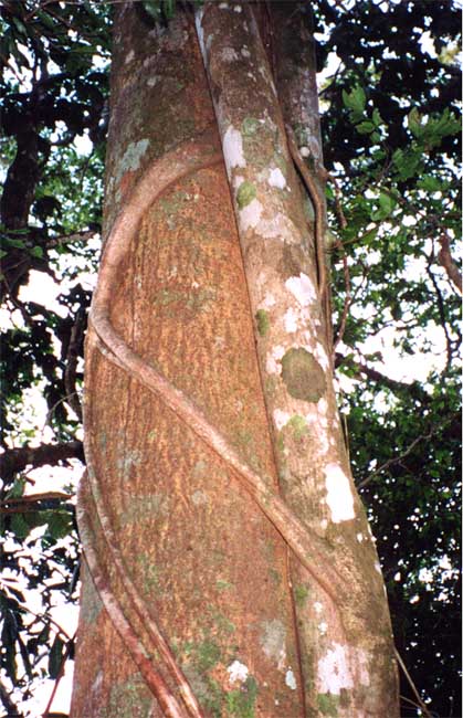 I mentioned that epiphytes don't damage the host tree. The strangler fig, shown below, is not a true parasite. It will fully envelope a living tree, ultimately grow higher than the host and block off the host's light. It doesn't actualy harm the host until the sunlight is blocked. The host then dies and decays, leaving only the strangler fig.
