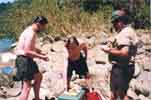 Seems like people leave their used trees all over the river. This gravel bar housed a tree which looked innocent enough until you look closely -- it's well defended! Your webmaster is in the center with the red hat. My red hat has probably reached the Caribbean by now, and is, alas, lost.