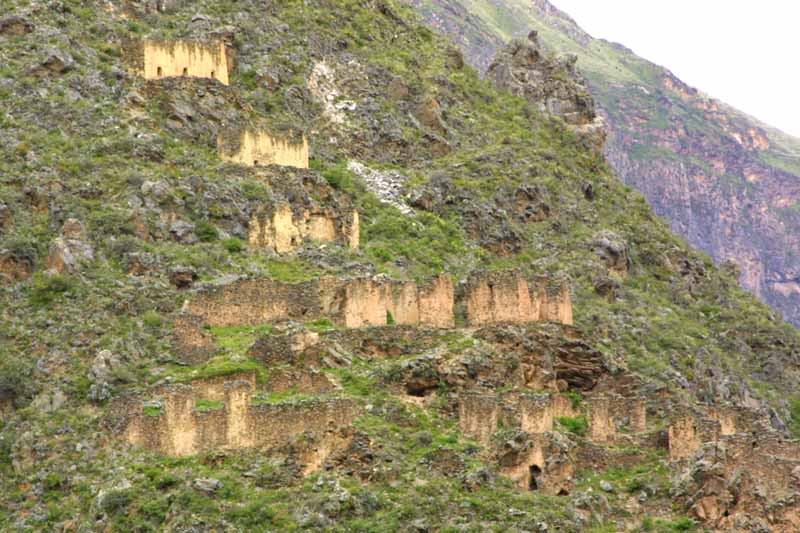 At the end of the road which leads towards Machu Picchu is Ollantay Tambo. It is referred to as a fortress, probably because it was attacked by the Spaniards, although it most likely was built as a simple settlement. Up on the opposite side are a number of storage buildings, located there because it is always windy and this kept the food which was stored there dry. Our guide, Manuel, likes to make illustrations in the ground.
