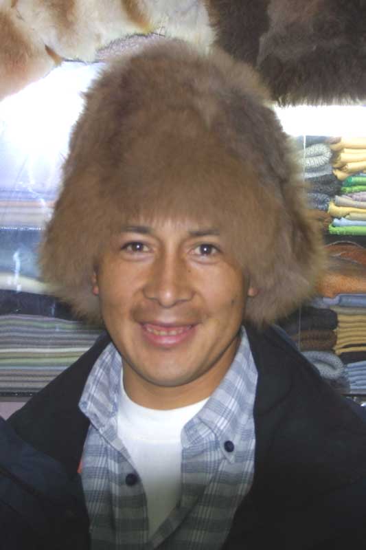 After leaving the site, we went to a nearby store which specialized in Alpaca and Vicuña products. Manuel looks fetching when he tries on a Vicuña hat...