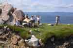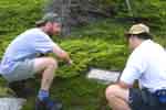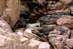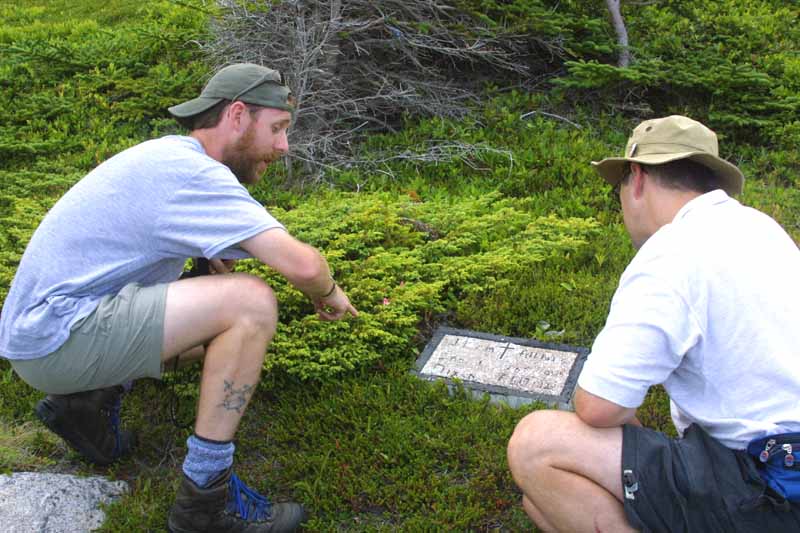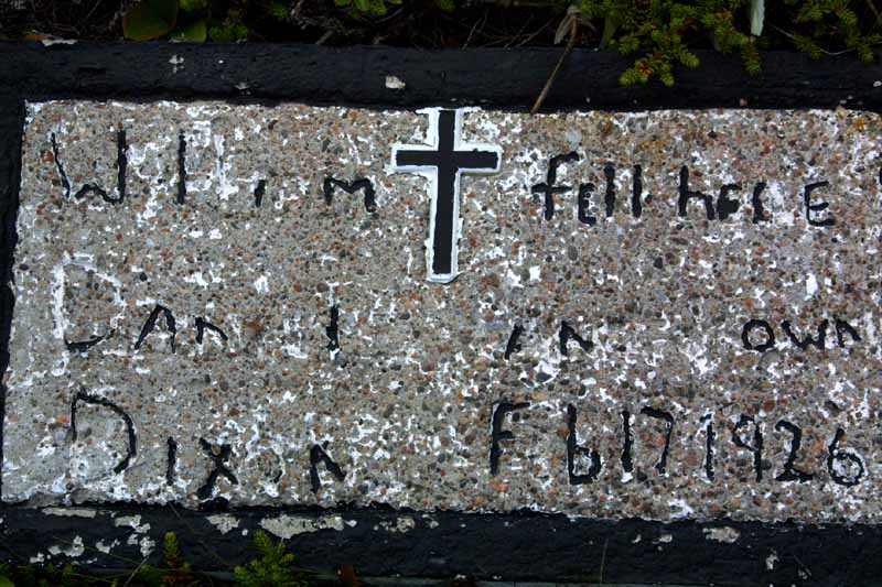 I spotted what I first took to be a grave marker. Here Tom and guide Bernie examine what appears to actually be a memorial marker for someone who fell off the cliff. It's very hard to read, but might say: "William Daniel Dixon fell here ???? town? Feb 17 1926".