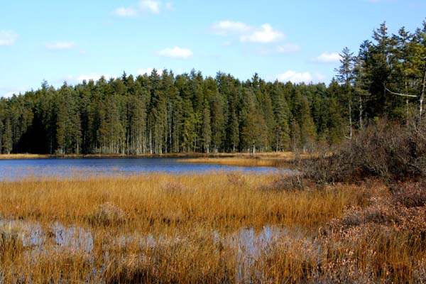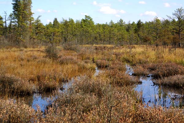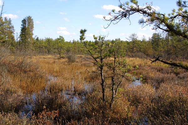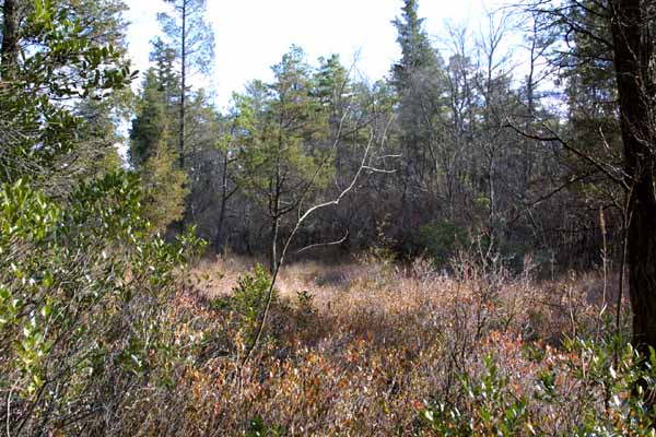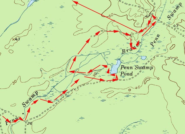 After lunch, a quick bushwhack took us to a sand road, which we followed to the edge of the cedar swamp. We decided to cross the cedar swamp and get to the fence. The reason for the fence is that the state allowed Penn Swamp to be clear-cut at one time, and when they tried to reforest it, they found the deer ate all of the seedlings. We found a place to get under the fence just so, as Dennis put it, the next time we walked by it we wouldn't have to wonder what was behind the fence. What's behind the fence is thick growth of young (10' - 15') cedar trees and lots of water. We went back under the fence and followed it to Quaker Bridge road. From their we buskwacked for the cars a couple of miles. Here's where our exploration took us.