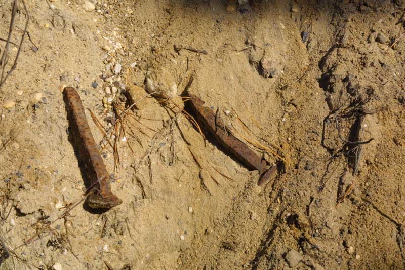 We intersected a dike and followed it. Near the railroad tracks we discovered that the railroad bridge had been removed, and all we found of it were some spikes.