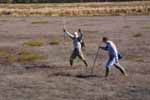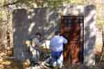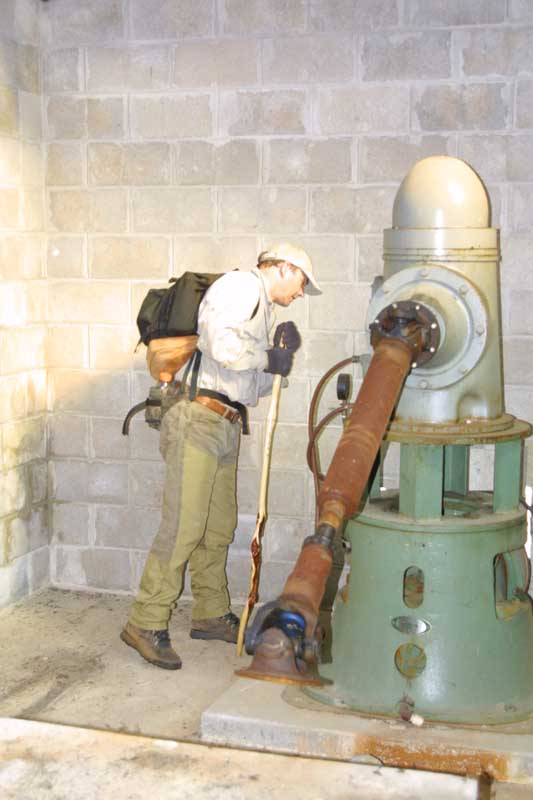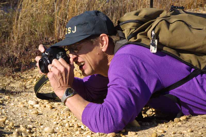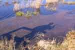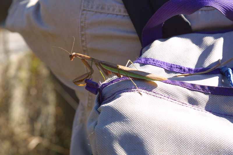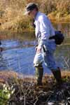 Moving on to a new bog, Mike and Phil decide to go out and look at plants. The picture of the shadow is of Phil standing by a sluice gate. We also found a dump where the leftover crud from cranberry production was deposited, and our plant guys had to see what was growing there. Then we found a sand hill near an old blueberry field. After that we found another pump house, but this on still had a pump in it, which Bob M. is examining. After we left the pump house, someone noticed that Phil was carrying a passenger in the form of a praying mantis...