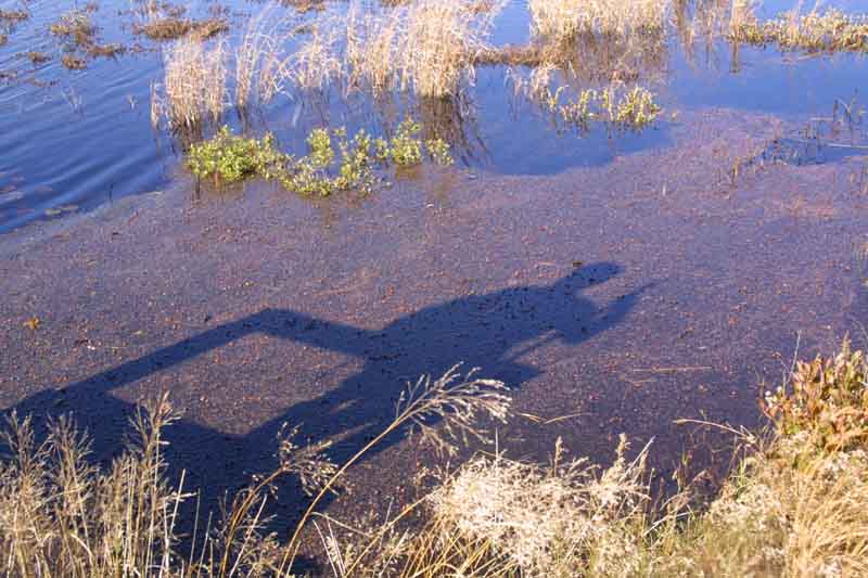 Next, before coming into the main part of the bogs, we came across an old pump house. Emerging into the bogs, we found a beautiful reservoir. Some PBXers, being PBXers, couldn't resist walking on to a bog. Mike can be seen with his camera in the prone position, prior to he and Guy setting up a group photo...
