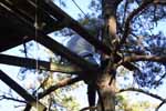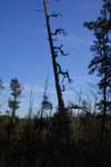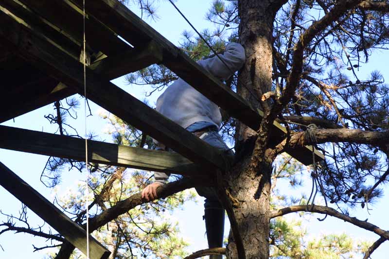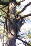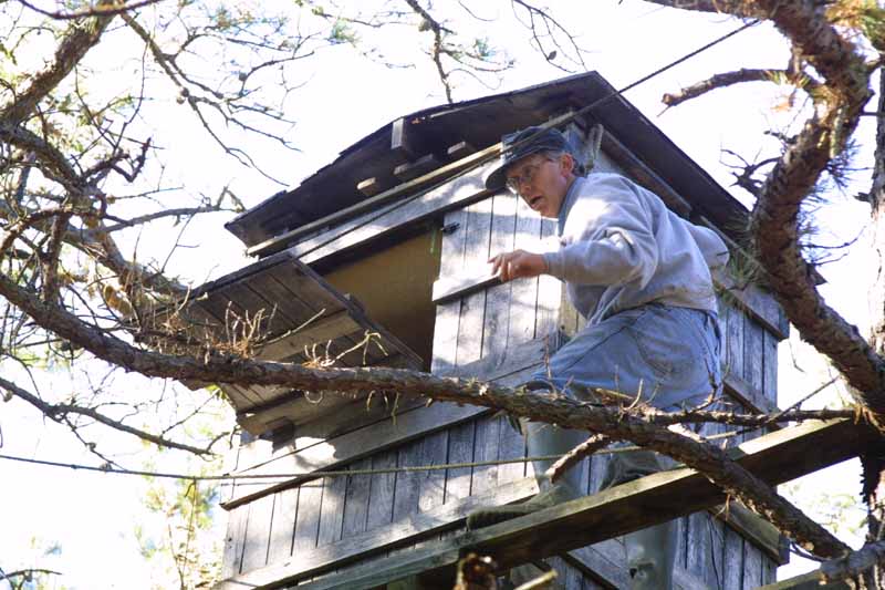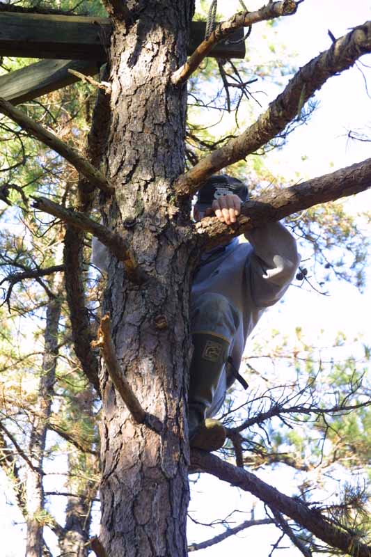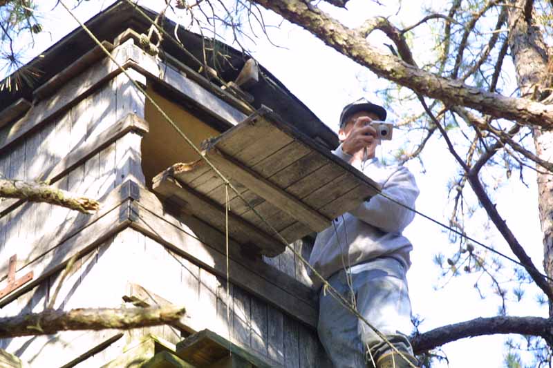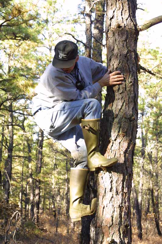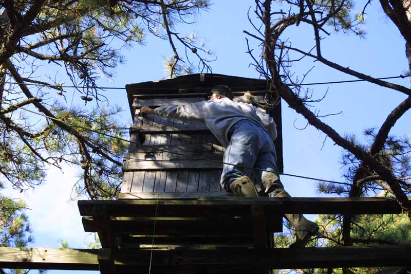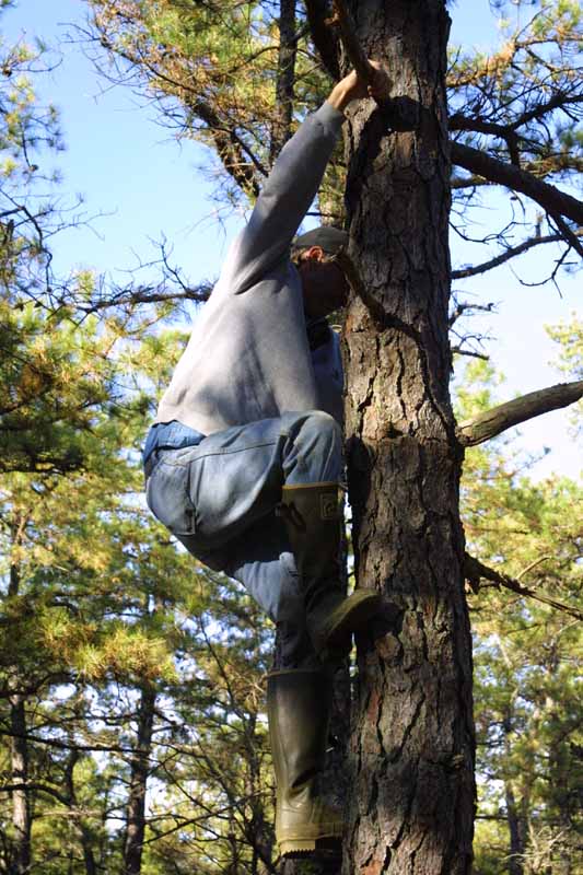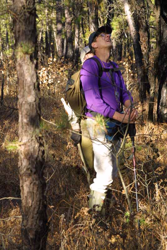Then, on a bushwhack to get us to the Wading River, we found a huge deer stand supported by two trees and a post. Guy, of course, had to climb it. Mike looks up in amazement!