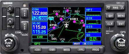 The annual found some airworthiness problems which George had Performance Aviation correct, as we had agreed. On February 10, 2003, we consumated the deal, and I was now an aircraft owner. I had some avionics work done before flying the airplane -- an old Bendix/King KX170B nav/com radio was replaced with a 21st century Garmin 430 moving map GPS/nav/com, the transponder was replaced with a new Garmin unit so I could have traffic info displayed on the GPS, and i replaced the old emergency locator transmitter (ELT) with a new-fangled one which can be tracked and located quickly via satellite. Subsequently, I also replaced the old audio panel with a new Garmin after I experienced a transmit problem on the remaining Bendix/King KX155 radio. Click on the image below to see what a Garmin 430 looks like.