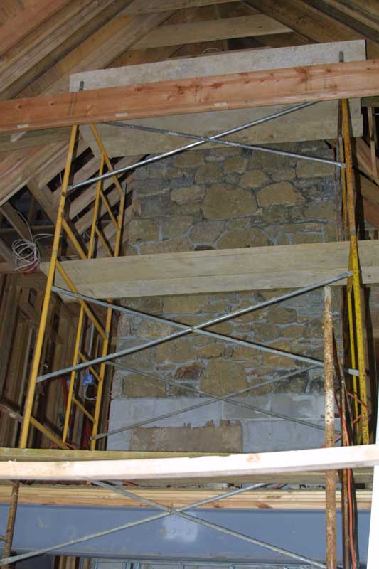 Meanwhile, things are happening on the inside. On the plumbing front, they had the templates out for the whirlpool baths so we could decide where to put the fixtures. The detail shot shows how the recirculating hot water system works: we will have instant hot water because the hot water system continuously recirculates. The small pipe on the right hand side in the return pipe for the hot water. The other interior shots are the chimney exterior in the library, the antique transom, and the front door (which is cuurently in the den!).