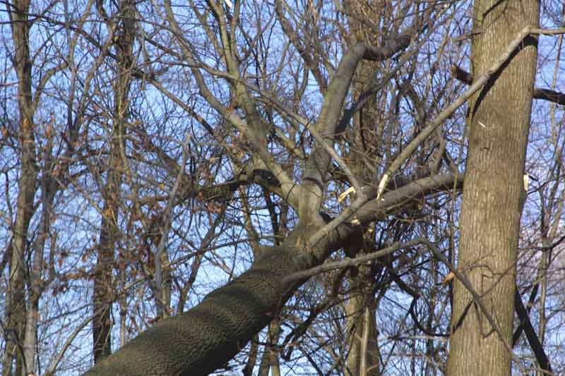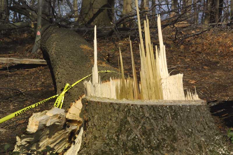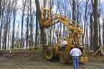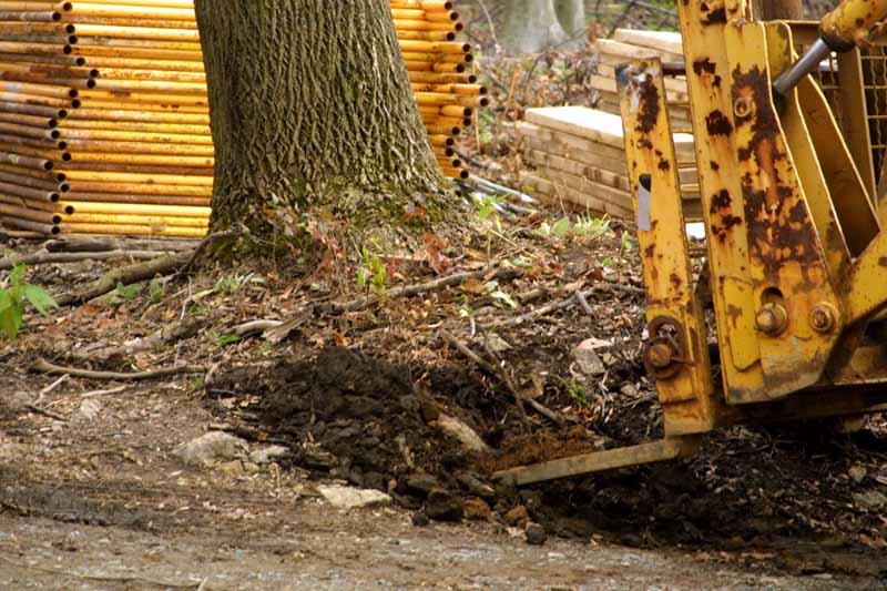 When we arrived on site this time, there was yellow caution tape where we usually park my truck. There were high winds the night before and a very large poplar tree was very close to coming down by itself. The contractor first tried to push it over with a forklift (and to try lifting the roots up as well), but it wouldn't quite go. Finally, the guy who had done the site prep work came over. It only took him about a minute to fell the tree...