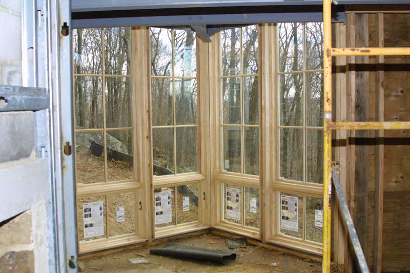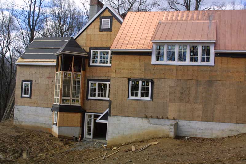 The next three pictures show the copper roof being intstalled, the main entrance, and the garage. Next is a picture of two story den/library (the steel is to support the walkway around the library. The next three pictures show the triangular structure which is the guest bathroom in the basement, the breakfast nook on the first floor, and a reading nook off the library. The last shows stucco samples against the stone we'll be using on part of the house.